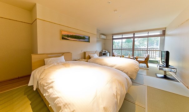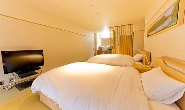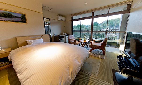 玉之湯の新スタンダード、全畳敷きの「和洋室」と素足でも心地よいフローリングが特徴の「洋室」。ドアを開けて驚かされる空間の奥行きと、バルコニー越しに見える川内川の流れ。ゆとりある間取りとほのかな部屋の明かりが、普段の旅を一層盛り上げてくれること間違い無し。