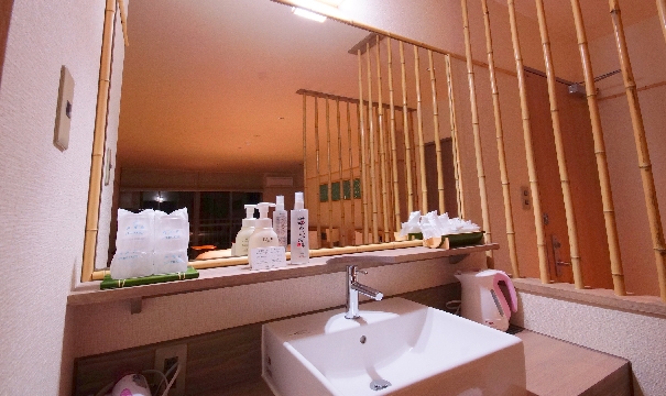 玉之湯が自信をもっておすすめする特別室「かぐや」は、館内唯一の空間にふさわしい、約32畳のゆとりある広さとしつらえでお客様をおもてなしいたします。ゆっくりと足をのばせる畳の間に、ゆるやかに竹で仕切られたベッドルーム。パウダールームは2つの洗面シンクを備えており、女性の2人旅などでも気兼ねなく使っていただけます。